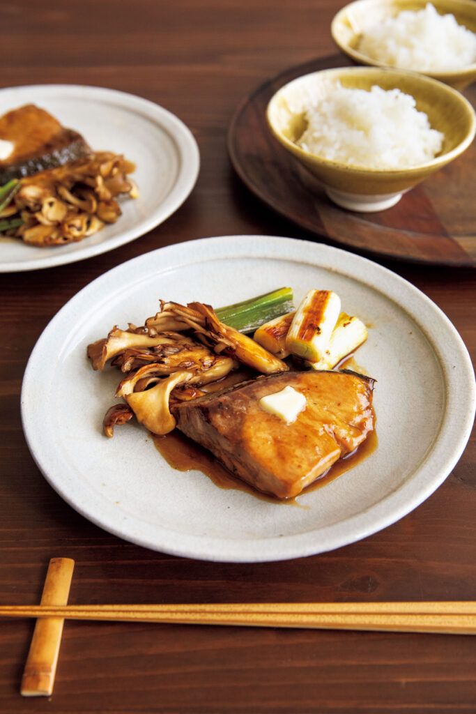 〈バターポン酢だれ〉の材料を加え、再び中火にかける。煮立ったらまいたけにさっとたれをからめて、すぐに取り出す。スプーンでぶりにたれをかけながら、照りが出るまで煮からめる。ぶりとねぎをまいたけとともに器に盛ってたれをかけ、仕上げ用のバターをのせる。