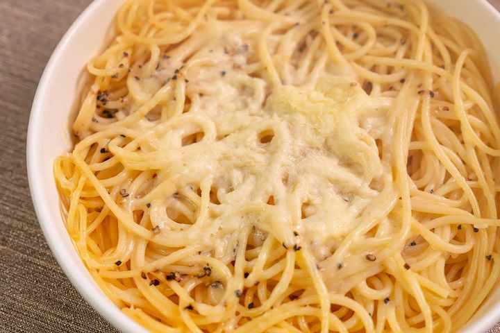 パスタにソースとチーズをしっかり絡めて食べると……超おいしい! にんにくの香りとうまみ、チーズのコク、ふわっと香るバターが絶妙にマッチし、黒胡椒のキリッとした刺激がよいアクセントになっています。シンプルな味付けだけどパンチがある、やみつき感のあるおいしさですね。