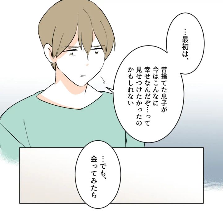 その後、「・・最初は、昔捨てた息子が、今はこんなに幸せなんだぞ・・って見せつけたかったのかもしれない・・でも、会ってみたら」と義父への想いをポツリポツリと語りだしたショウタ。
