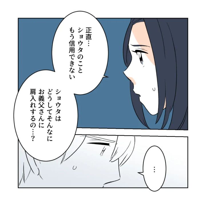 「正直・・ショウタのこともう信用できない。ショウタはどうしてそんなにお義父さんに肩入れするの・・?」ずっと不思議に思っていたことをたずねると、「・・・」ショウタは何も言えなくなってしまいました。