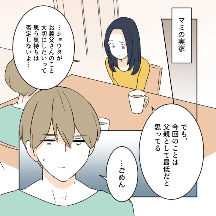 「・・ショウタがお義父さんのこと大切にしたいって思う気持ちは否定しないよ・・でも、今回のことは父親として最低だと覆ってる」そう言うと、「・・ごめん」としんみりしながらショウタが謝りました。
