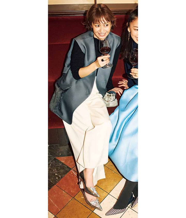 パンプス[ヒール5㎝]¥161,700バッグ¥204,600(ともにジミー チュウ)ジレ¥132,000(エブール/リトルリーグ インク)ニット¥24,200(オスロー/フィルム)パンツ¥47,300(キャバン/キャバン 丸の内店)ピアス¥42,900イヤーカフ¥26,400(ともにヒロタカ/アバロン)リング¥59,400(ヒロタカ/ヒロタカ 表参道ヒルズ)
