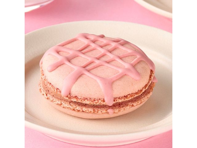 アーモンドパウダーをたっぷり使用したピンク色のマカロン生地に、いちごチョココーティングを格子状にかけ、いちごソースとミルククリームをサンドした本格志向の大きめなマカロンです。甘酸っぱいいちごとミルクのコクが、マカロンのおいしさを引き立てるデザートです。 JANコード4907174139375 カロリー:167kcal
