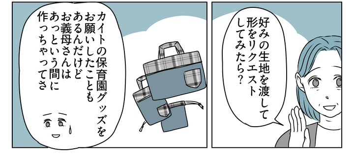 母が「好みの生地を渡して形をリクエストしたら」と提案してくれたのですが、実は以前、義母には息子の保育園グッズをお願いしたことがあり……。