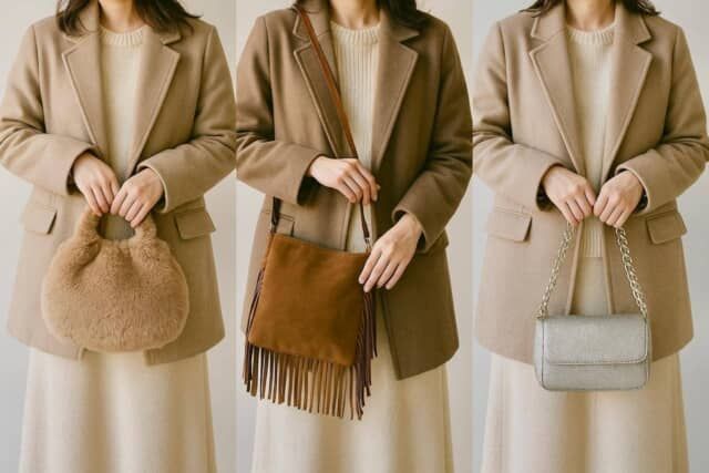 今なら、毛足の短いエコファーやボアを部分的に配したミニバッグへシフトするだけで、季節感を残しつつも品よくまとまります。
