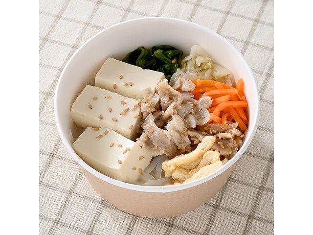 8品目具材を使用した食べごたえのあるごま豆乳スープです。豆乳をベースに白だしや白みその旨み、ごまの風味をきかせた仕立てで、具材には平はるさめ・豆腐・豚肉・野菜などを使用しています。 ※山梨県の一部、長野県、宮崎県、鹿児島県では取り扱いがございません。 関東・東海・九で販売