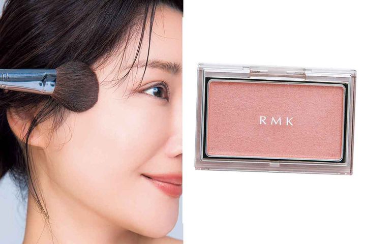 眉尻、目尻、口角、小鼻など、全てのパーツの外側が下がってくるので、引き上げて見せるメイクにチェンジ。アイブロウは眉山をきちんと作り、アイラインは目のフレームから少し跳ね上げ、チークは頰骨に沿って斜め上に。RMKのピュア コンプレクション ブラッシュの14番で、頰骨に艶感を足すと、肌がパンッと張った印象になります!