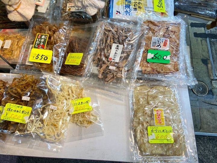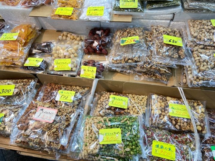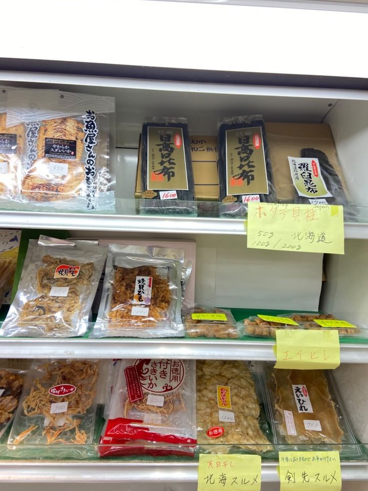 店内1歩入ると柿の種・アーモンド・カシューナッツといったおつまみ、ドライフルーツなどの干し菓子や、イカ製品をはじめとした珍味が天高く山積みに販売されていました。普通のスーパーではなかなかお目にかかることができない商品ばかりでした。女性ひとりでも買い物しやすい雰囲気のお店で、お店の方もズカズカと声かけてこないでゆっくりと買い物することができました。