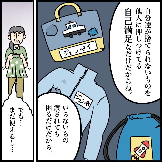 「自分達が捨てられないものを他人に押し付けてる『自己満足』なだけだからね、いらないもの渡されても困るだけだから」義姉はストレートに伝えました。しかし、ここまではっきり言われてもわからないのか、義母は指先をつつきながら「でも、まだ使えるし・・・」と、もごもごと言葉を濁します。