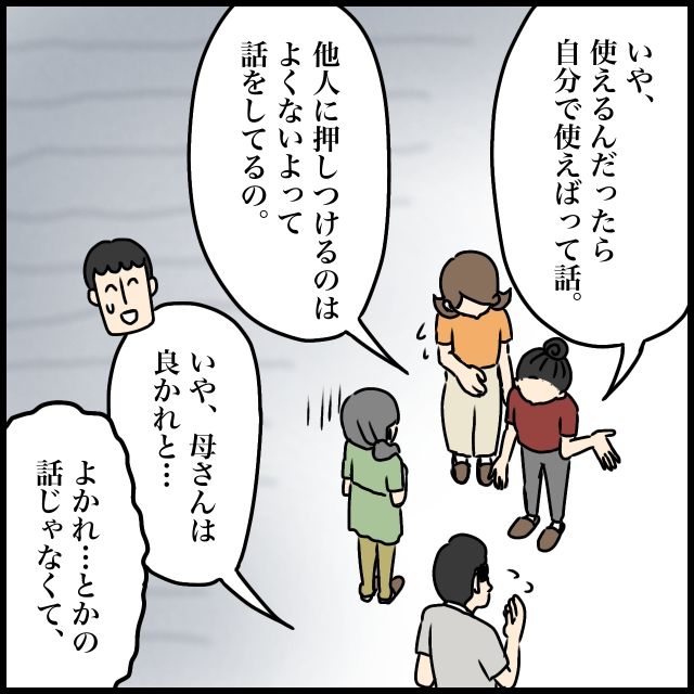 「いや、使えるんだったら自分で使えばって話、他人に押し付けるのはよくないよって話をしてるの」なかなか伝わらないことにやきもきしたのか、義姉の口調は次第に強くなります。ジュンペイが義母を庇って「いや、母さんは良かれと・・・」と言うと、義姉は即座に「良かれとかじゃなくて」と話を遮りました。