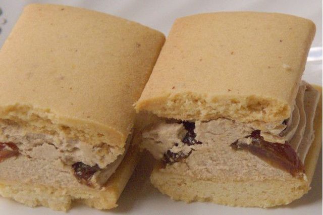 サクほろ食感のクッキーで、キャラメルバタークリームとラムレーズンをサンドしてあります。