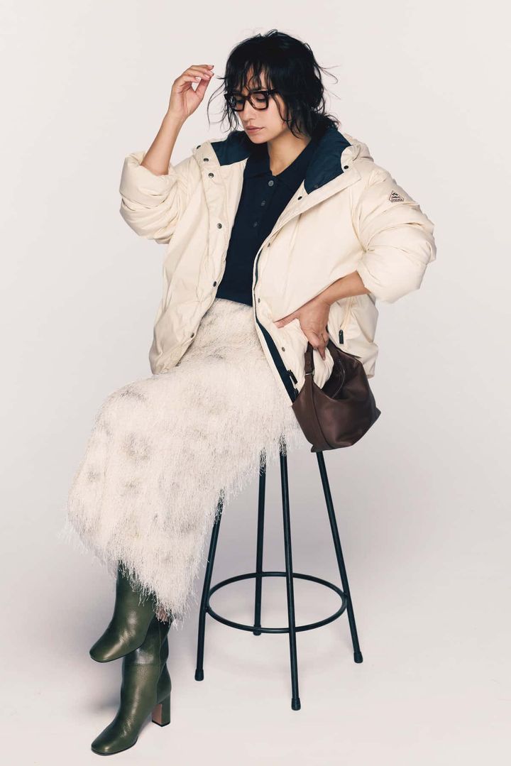 ダウンジャケット¥106,700(ピレネックス/ピレネックス マロニエゲート銀座)ニットポロ¥39,600(デミリー/リトルリーグ インク)スカート¥97,900(エブール/リトルリーグ インク)バッグ¥253,000(ヴァレクストラ/ヴァレクストラ ジャパン)ブーツ¥143,000(ペリーコ/アマン)メガネ¥49,500(モスコット/モスコット トウキョウ)