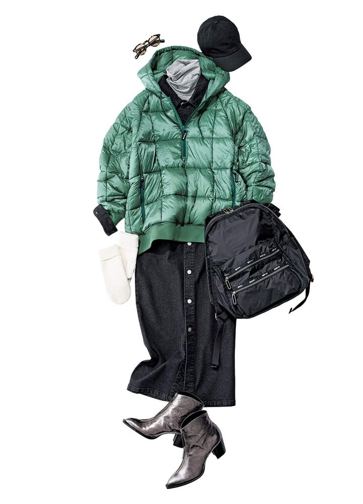 アノラック¥39,600(ワイルドシングス × シンゾーン/シンゾーン ルミネ有楽町店)デニムワンピース¥44,000(ウィム ガゼット/ウィム ガゼット 玉川髙島屋S・C店)タートルネックカットソー¥20,900(オットダム/パサージュ ドゥ ストックマン 恵比寿店)バックパック¥29,700(レスポートサック/レスポートサック カスタマーサービス)ブーツ¥44,000(銀座かねまつ/銀座かねまつ6 丁目本店)サングラス¥47,300(アイヴァン/アイヴァン 東京ギャラリー)キャップ¥7,700(アストラット/アストラット 新宿店)ニットミトン¥1,990(ユニクロ)