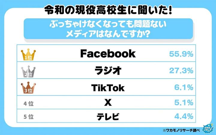全国の高校生429人を対象に「なくなっても困らないメディア」を調査したところ、1位は「Facebook(55.9%)」、2位「ラジオ(27.3%)」、3位「TikTok(6.1%)」となりました。Facebookは「おじさん向け」「使ったことがない」といった理由で敬遠され、ラジオも「年配向け」の印象が強い一方、TikTokには「民度が低い」「危険」といった声が見られました。