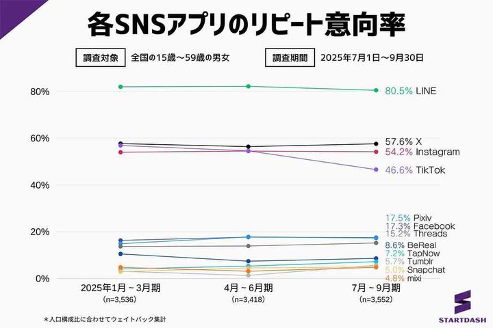 リピート意向でもLINEが80.5%でトップを維持。SNSはLINEが生活インフラとして定着する一方、他アプリもユーザーの多様なニーズに応え続けています。