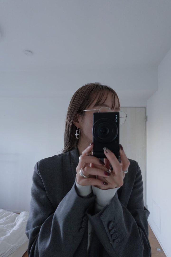 「アメリのジャケットと、ナウンレスのパンツを合わせてグレーのワントーンも意識しました。顔まわりの小物もシルバーを使い、全体的に統一感が出るように。足元はアシックスの黒スニーカーを入れて、ラフにまとめてみました」(MARTE/saharaブランドマネージャー、SYKIA デザイナー三好香織さん)