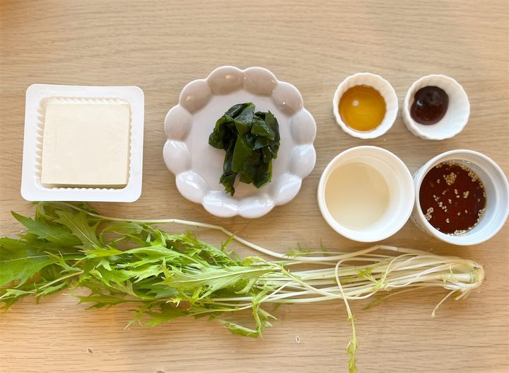 1. ボウルに水菜・わかめ・豆腐を入れ、[A]の調味料を加えて全体をやさしく和える。