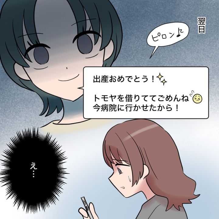 出産まで入院することになったアヤノさんに、出張から帰ったトモヤさんが送ったのは「キョウカさんの子どもが産まれたから実家に戻るよ」というメッセージ。「すぐ来てくれるよね」と不安になるアヤノさんの予感は的中!その日に出産することになったのに連絡が取れず、結局一人で出産したアヤノさんの寂しさ・・そんな想いをさせておきながら、「トモヤ借りてた。今から行かせるから」と上から目線の悪意あるメッセージを送ってくるキョウカさん、友達になれる気が全くしませんよね。