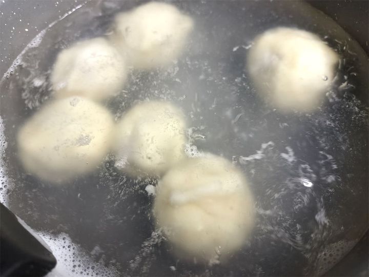 4. 里芋を3の生地で包んで丸め、たっぷりのお湯(分量外)で茹でます。