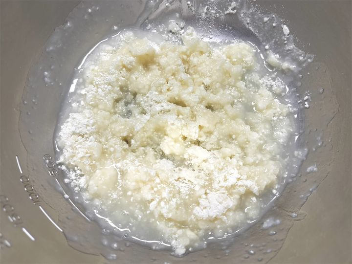 3. 温度が下がってきたら手でこね、耳たぶよりやわらかくなったらラップで包んで20分ほど寝かせます。