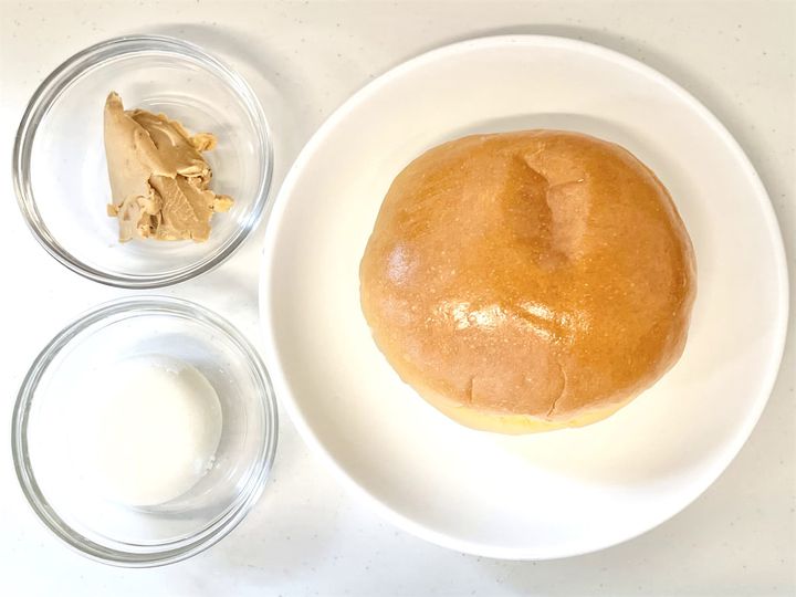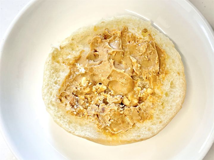1. バーガーバンズの下側にピーナッツペーストを塗り、皿にのせる。