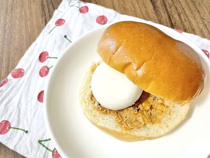 ピーナッツペーストの塩味と雪見だいふくの甘味が相性抜群。バンズは少しぱさつきますが、雪見だいふくが溶けるとじゅわ〜とバニラアイスが染み込むのでおいしくいただけます。トーストすると、アツヒヤが味わえてより面白いとも思いました。