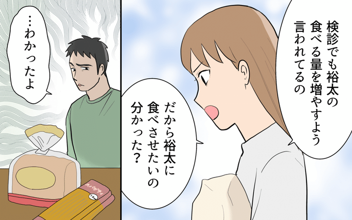 ■これまでのあらすじ 食べることとなると見境がつかなくなる夫を持て余しながら、妻は子育てに奮闘中。ある日、冷蔵庫を開けると離乳食のストックがなくなっていた。夫が食べ尽くしていたのだ。妻が怒っても「俺が働いて買ったものを食べて何が悪い」と逆ギレするばかりで話が通じなかった。