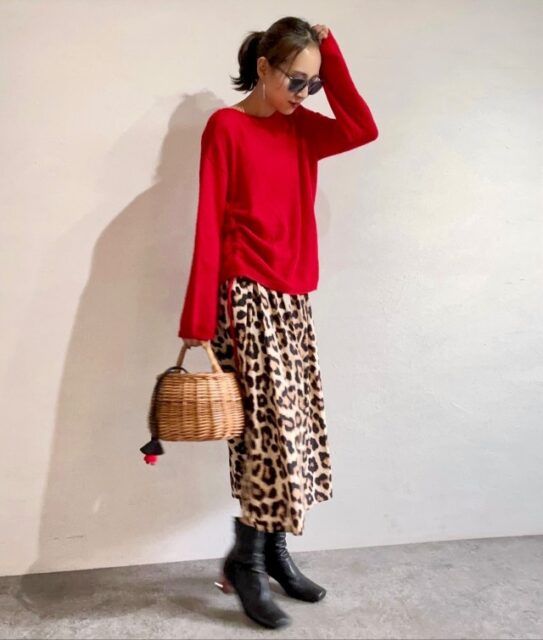 目を引くフレッシュなレッド(赤)は2025秋冬のキーカラー。ニットをこの色に変えるだけで今年らしさがグッとアップします。スナップのように、レオパード柄のボトムスと合わせて大胆に楽しむコーデも新鮮です。
