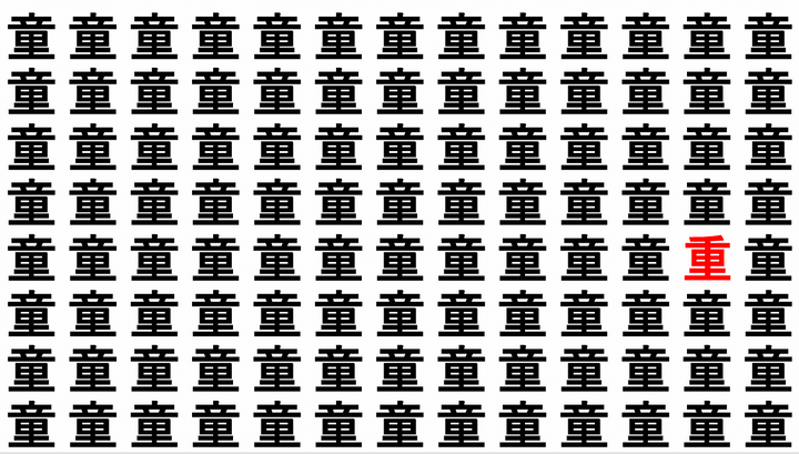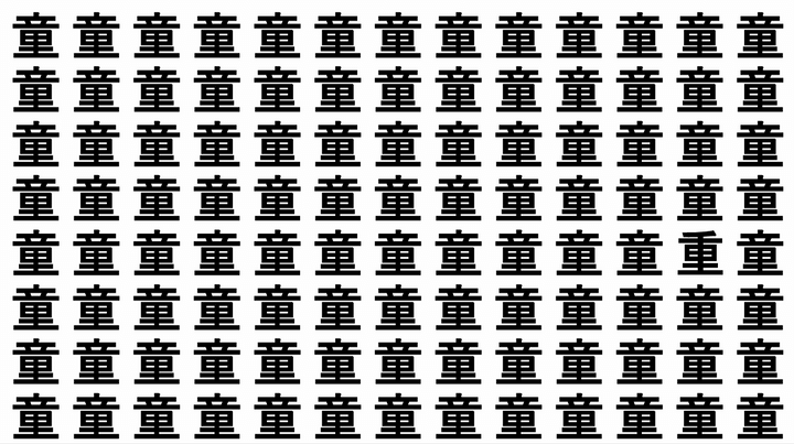 たくさんの「童」の中に、よく似た別の漢字が1文字だけ隠れています。
