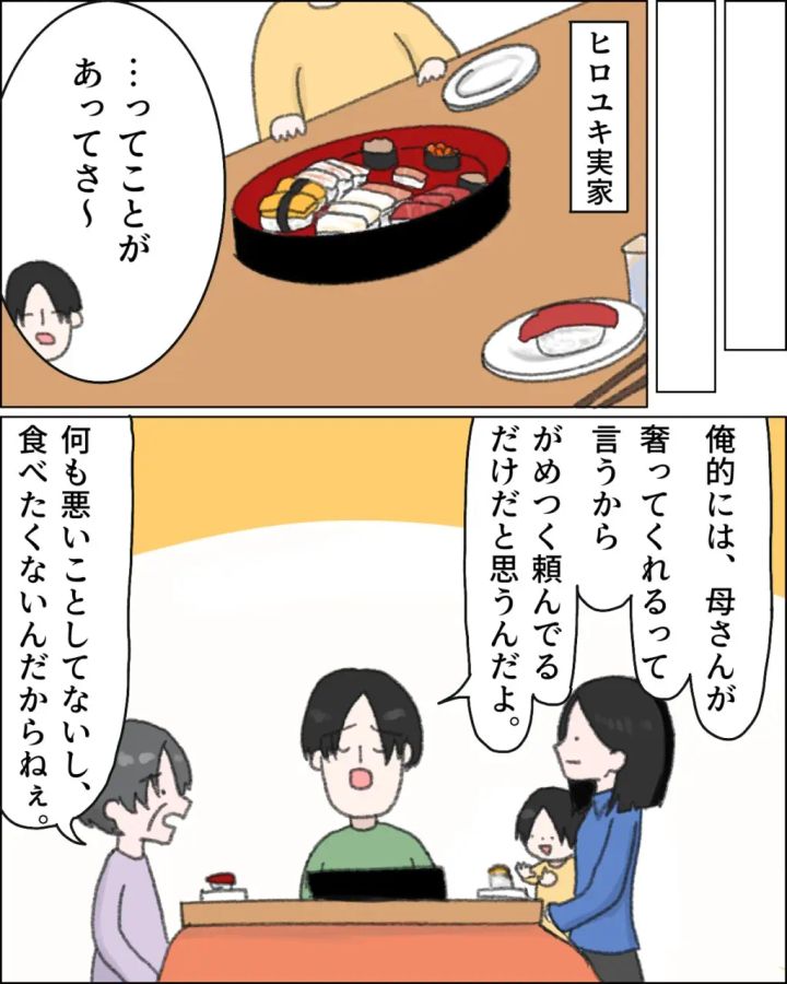 数日後、宣言通り単身で実家に帰省したヒロユキは、外食の件で私と揉めたことを、そのまま義母と義妹のマリちゃんに話しました。「俺的には、母さんが奢ってくれるって言うからがめつく頼んでるだけだと思うんだよ」ヒロユキはうんざりした表情で言います。義母も「何も悪いことしてないし、食べたくないんだからねぇ」と当然のように同意します。