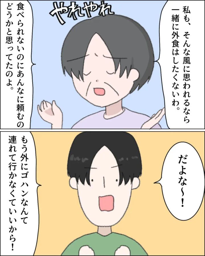 その後も2人の不満は止まらず、「食べられないのにあんなに頼むの、どうかと思ってたのよ」義母は呆れ顔。もう外食には誘いたくないとまで言い出しました。ヒロユキも「だよな~!もうご飯なんて連れて行かなくていいよ!」と同調するように不満をぶつけます。