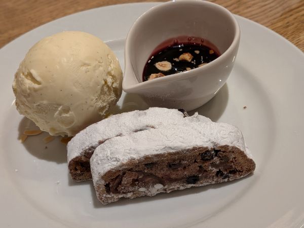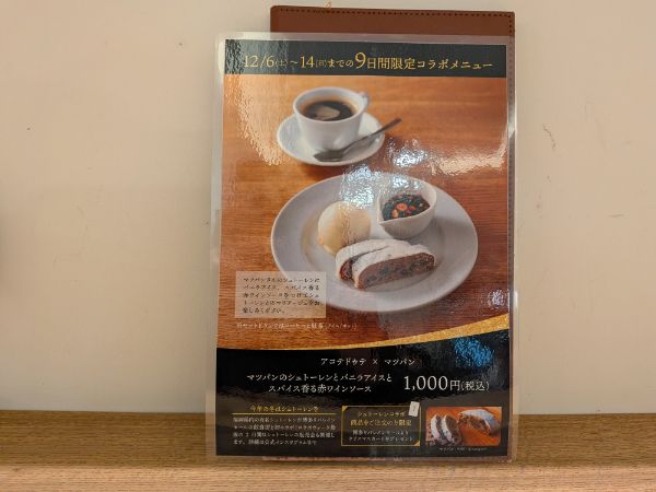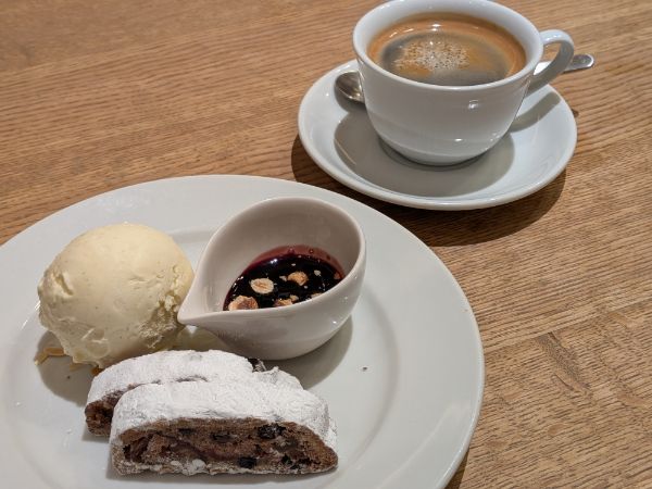 マツパンの『シュトーレン』に、「ア コテ ドゥ テ」のバニラアイスクリームと赤ワインソースを合わせたプレートとコーヒーか紅茶(ホットかアイス)のセット(1000円)です。
