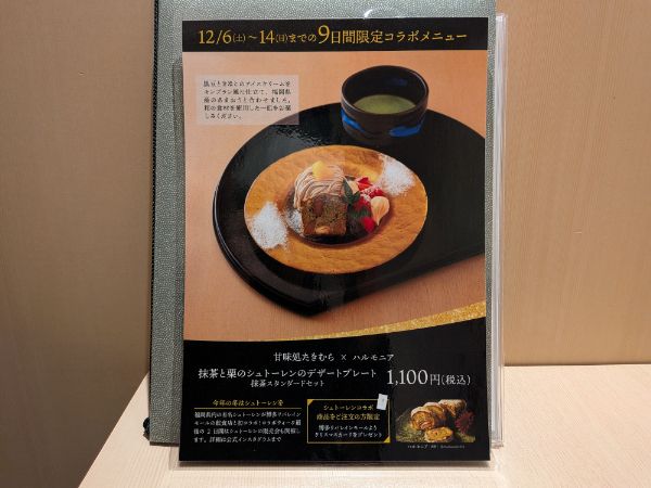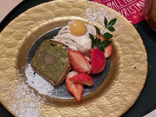 Harmonierの新作『抹茶と栗のシュトーレン』に、黒豆ときなこのアイスクリームをモンブラン風に仕立て、福岡県産のあまおうを組み合わせたプレートと「甘味処 たきむら」自慢のお抹茶のセット(1100円)です。和風のシュトーレンは、初めての出会い!