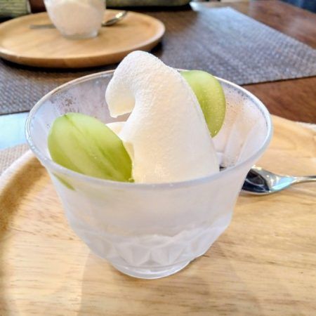シャインマスカットをトッピングで華やかなに提供されました。ひとくち食べてびっくり‼これはスイーツ店に負けないクオリティーです。濃厚でたまらないおいしさ‼後味はさっぱりだからスープカレーのデザートに最適でしたよ。