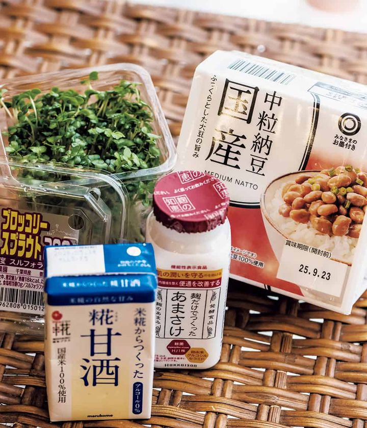 甘酒は飲む美容点滴と言われるほど、疲労回復、免疫力アップ、整腸作用などが期待できるそう。だるさが抜けない時によく飲みます。中粒納豆とスプラウトは混ぜてお蕎麦にのせたりも。スプラウトは各種ビタミンも豊富で肝臓機能の改善や、認知機能の向上、抗酸化作用に効果が期待できる栄養素が豊富だと聞いています。