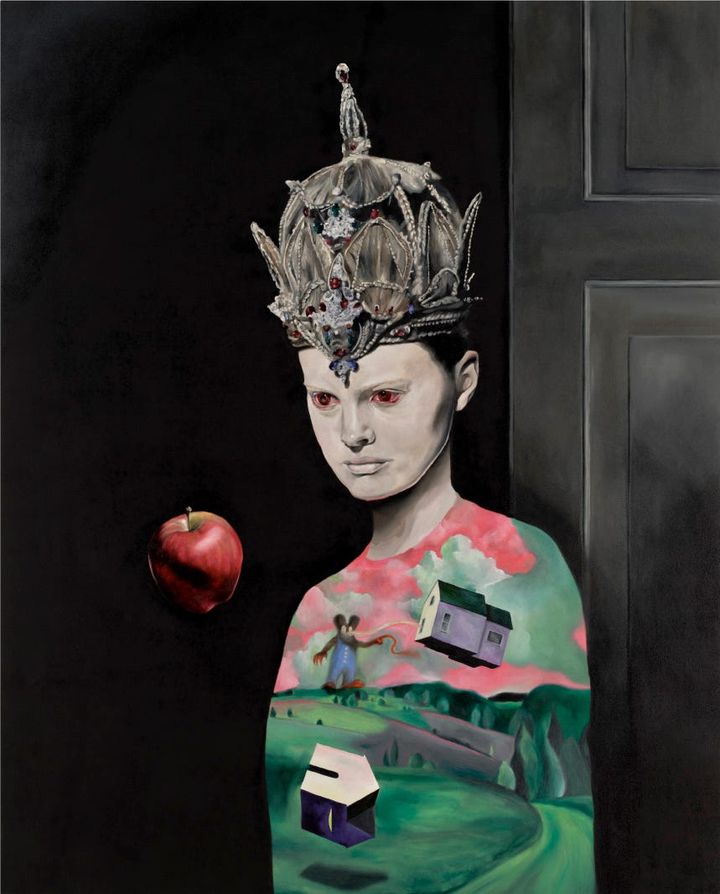 赤く染まり、血が流れ落ちそうな眼と王冠、手に抱えたりんごが印象的な作品では、よく見ると画面下部に小さなモンスターが家を破壊している様子が描かれている。本作《Don’t Sit Under The Tree II》のタイトルは、1940年のアンドリュー・シスターズの代表曲に由来し、戦争で離れ離れになる恋人に向けた歌として知られる。りんごはしばしば平和の象徴として描かれるが、この作品では、1枚の絵の中に破壊による絶望感と平和への願いが共存しており、現代の不安定な状況とも重なる。