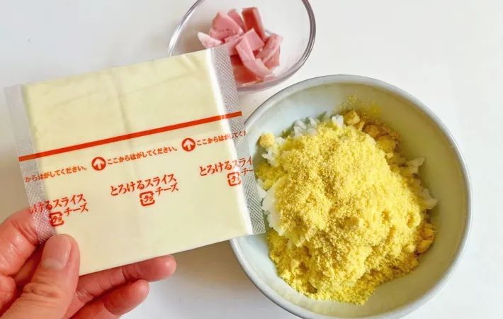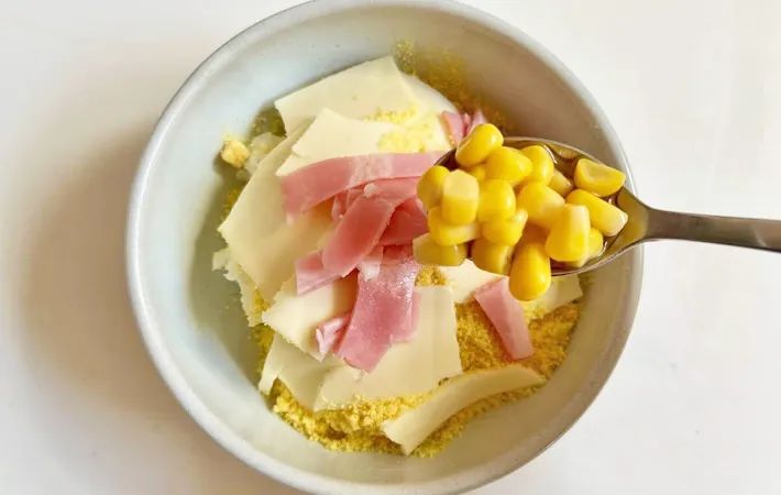 そこに、短冊切りにしたベーコンと、食べやすい大きさにちぎったスライスチーズをのせてください。コーンも加えましょう。