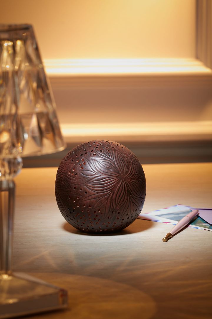 街がイルミネーションに包まれ、寒さがぐっと深まるクリスマスシーズン。そんな日は、おうち時間にそっと寄り添ってくれる香りに癒されたいものです。繊細な彫刻が施されたテラコッタ製の球体ディフューザー、“ラ ブル ランブル”はバニラやトンカビーン、ベンゾイン、アンバーをブレンドした独自のハーモニーがボールに収められています。置くだけで部屋中に優雅な香りが広がり、心も身体も穏やかに。オブジェのように美しいデザインが、空間を温かく彩ってくれることでしょう。