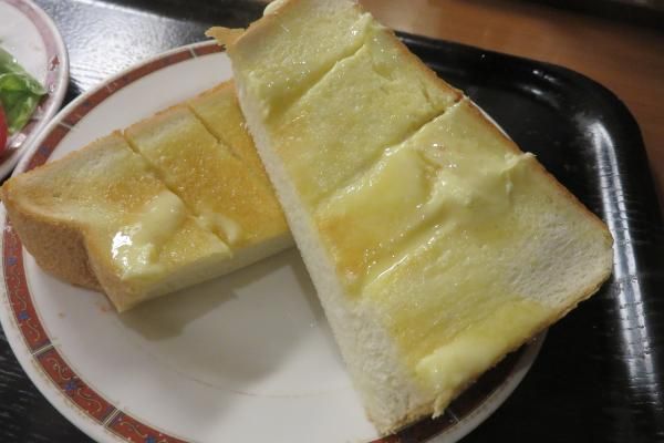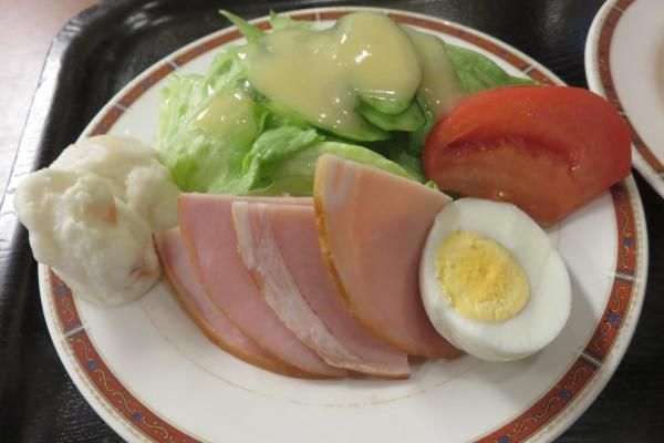 シャキシャキ食感のレタスと胡瓜、食べ応えのあるハム、瑞々しいトマト、どっしり構えた半分サイズの固め茹で卵、優しい味付けのポテトサラダ。サラダのお手本のようなラインナップです。自宅での朝食ではここまで用意する余裕はないので、優雅なモーニングだなと感じました。 セットにはご飯かパンが付きます。今回は、サラダに合わせてパンを選びました。