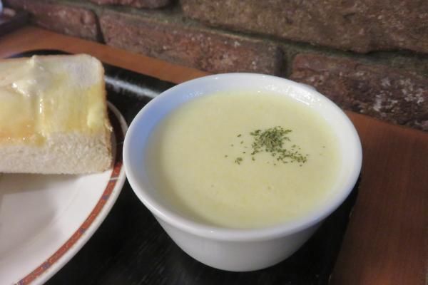 厚切りのサイズ感に驚きました。パン好きとして、こんなにも厚切りの食パンを頂けるとは…幸せです。厚切り故に、外側はさっくり焼き上げられていますが、内側にはしっとり感が残っています。食感のギャップが堪りません。更に幸福感を高めてくれるのが、厚塗りされたマーガリンです。温められた食パンの上に塗られているにも関わらず、溶けきっていない部分がある位の厚塗りです。一口一口幸せを噛み締めながら頂きました。 更に、味噌汁かスープを選ぶ事も出来ます。味噌に拘りがあると理解しつつ、今回はスープを選びました。