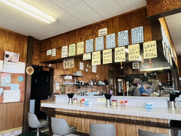 週末のお昼前だから、お客さんもまだ少ないだろうと思って入ったのですが・・・、すでにラーメンを召し上がっているお客さんたち!食べ終わって店を出るお客さんとすれ違いながら、店内へ入りました。店内は、昔懐かしい雰囲気。息子は「老舗」という言葉がぴったりなんだとか。