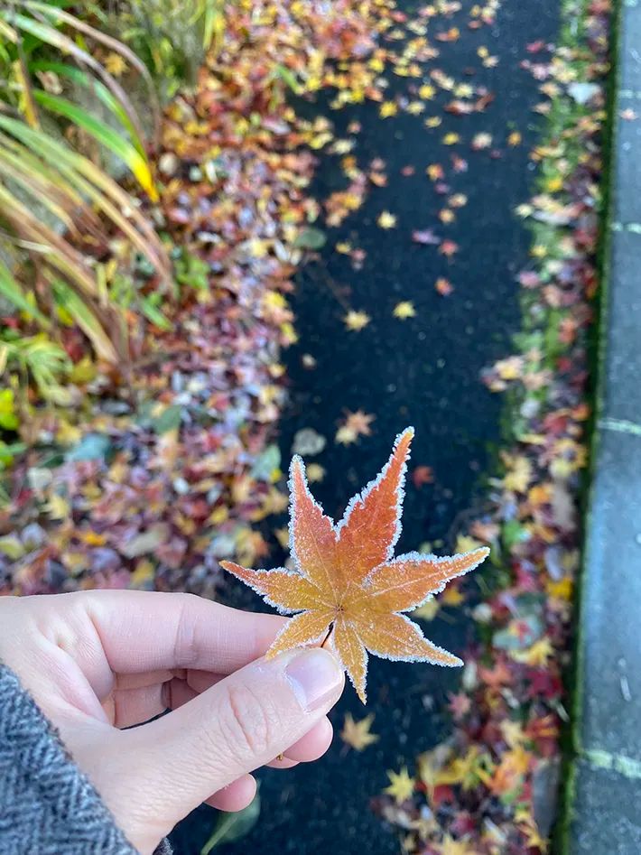 もりこさんが道端で偶然見つけたのは、ふちに霜が付着した紅いモミジでした!