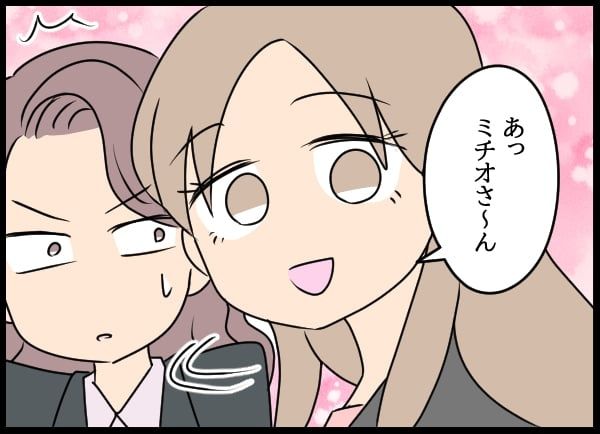 声をかけられた男性社員はミチオをしげしげと見つめました。おそらく「これがサトコが選んだ男か…」と思っていたのでしょう。