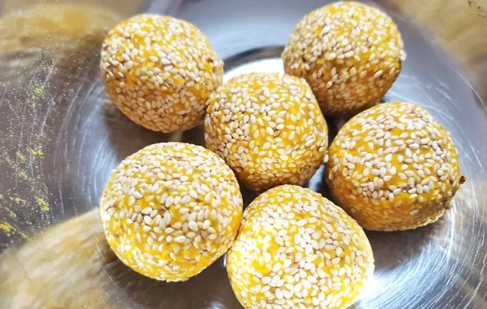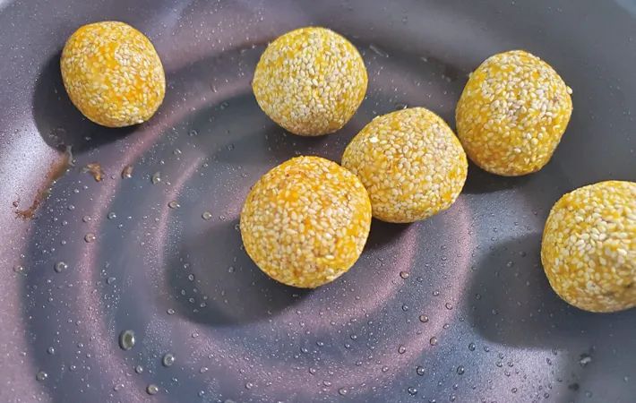 白ごまをかけて、丸めたカボチャをボウルの中で転がし、周りにまんべんなくつけましょう。