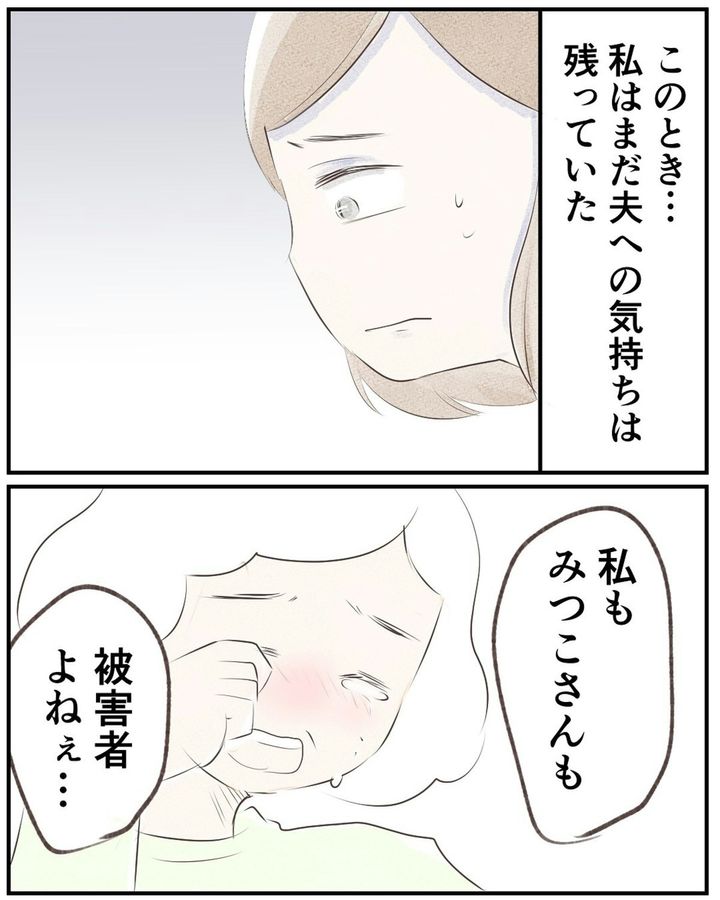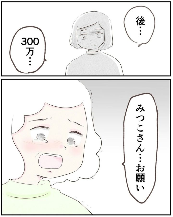 ある日、みつこさんは夫には300万円の借金があることを知ります。しかも夫は、その借金を返済するため、家計から数十万円を引き出し、ギャンブルにつぎ込んでいたのです。「全部負けちゃった」とへらへら笑う夫に嫌気が差し、しばらく実家に身を寄せていた みつこさん。