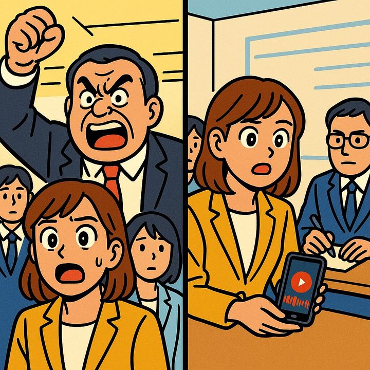 実はデスクの下で、スマホのボイスレコーダーを起動し、今の会話を一部始終を録音していたのです。