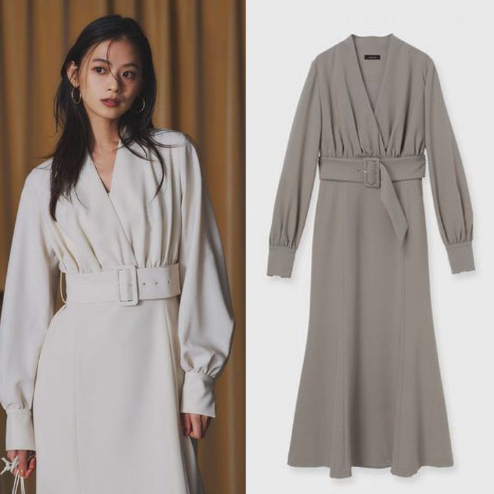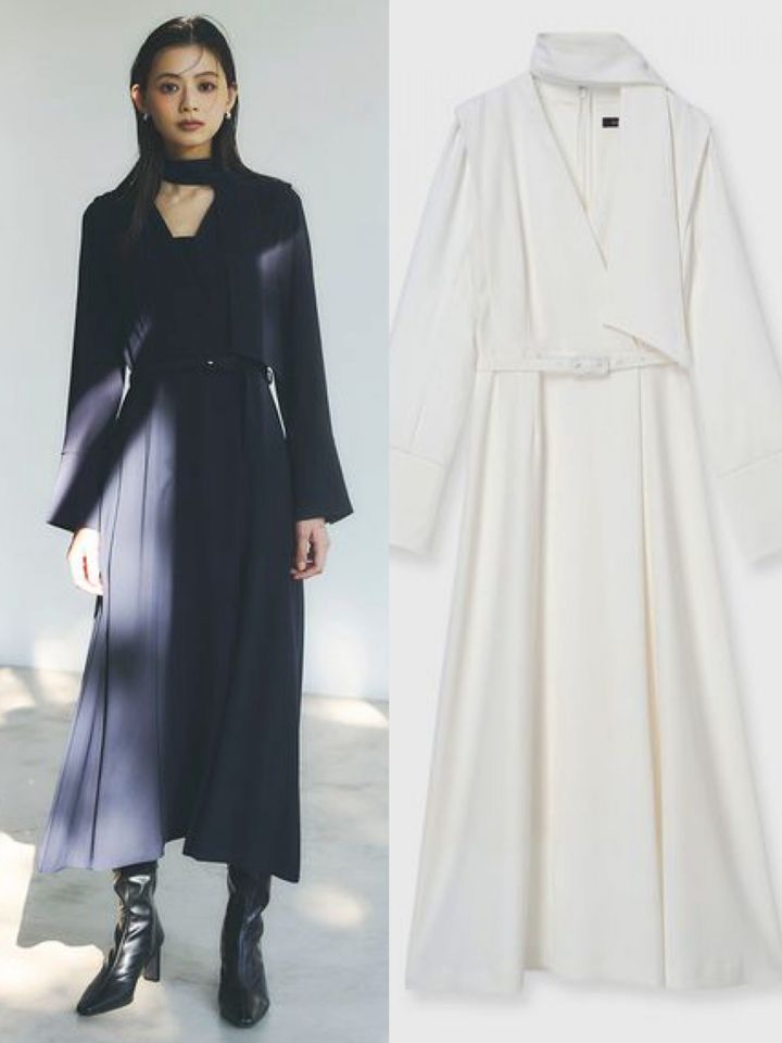 高級感のあるダブルサテンを使った、大人気のワンピース。今年は、共布のスカーフ付きで、着回し力がさらにアップ。落ち感が綺麗で細見えも叶う名品ワンピース。セミオケージョンにも。ダブルサテンクラシカルワンピース/アニュアンス