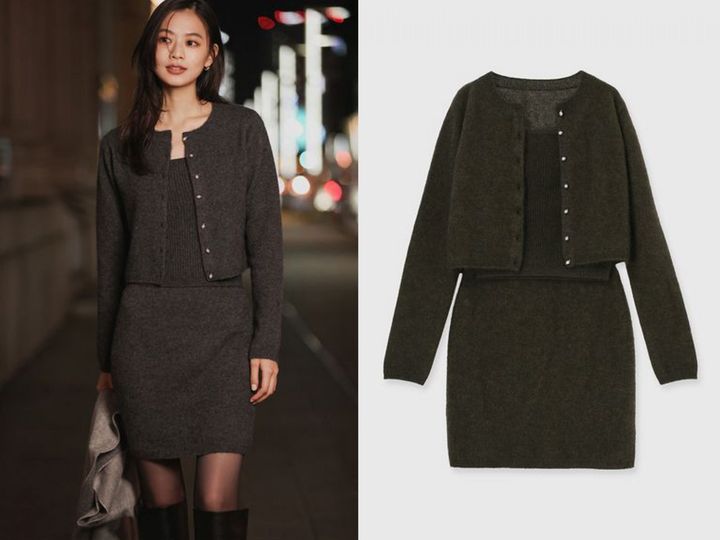 デイリーにも使いやすい、カーディガンとビスチェ、ミニスカートの3セット。ふわふわなヤクウールを使用。パール調のボタンもエレガント。【セットアイテム】ヤクウールニットセット/アニュアンス