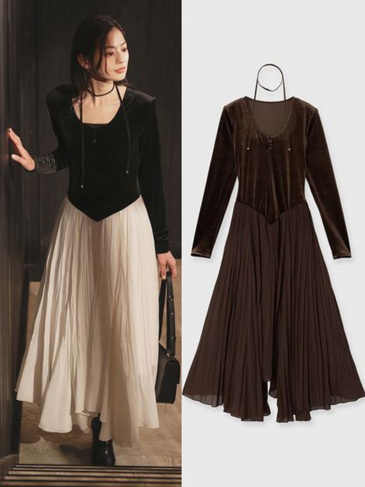 こちらはピッタリと体にフィットするベロアと、軽やかなシフォンのスカートをドッキングさせた、華やかな1枚。着るだけでメリハリあるスタイルに仕上がります。華奢なチョーカー付き。ベロアシフォンドッキングワンピース/アニュアンス