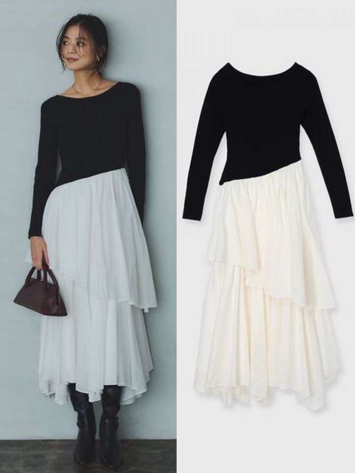 アシンメトリーなティアードスカートと、ニットがドッキングした華やかなワンピース。完売間近です。【USAGI ONLINE限定カラー】ボートネックイレギュラーヘムドッキングニットワンピース/アニュアンス